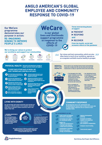 WeCare is Anglo American’s global response programme to support the lives and livelihoods of our workforce and host communities through the health, social and economic effects of the COVID-19 pandemic. Our mines and host communities, which are also often home to much of our workforce, operate as an ecosystem, and both must be healthy to prosper.